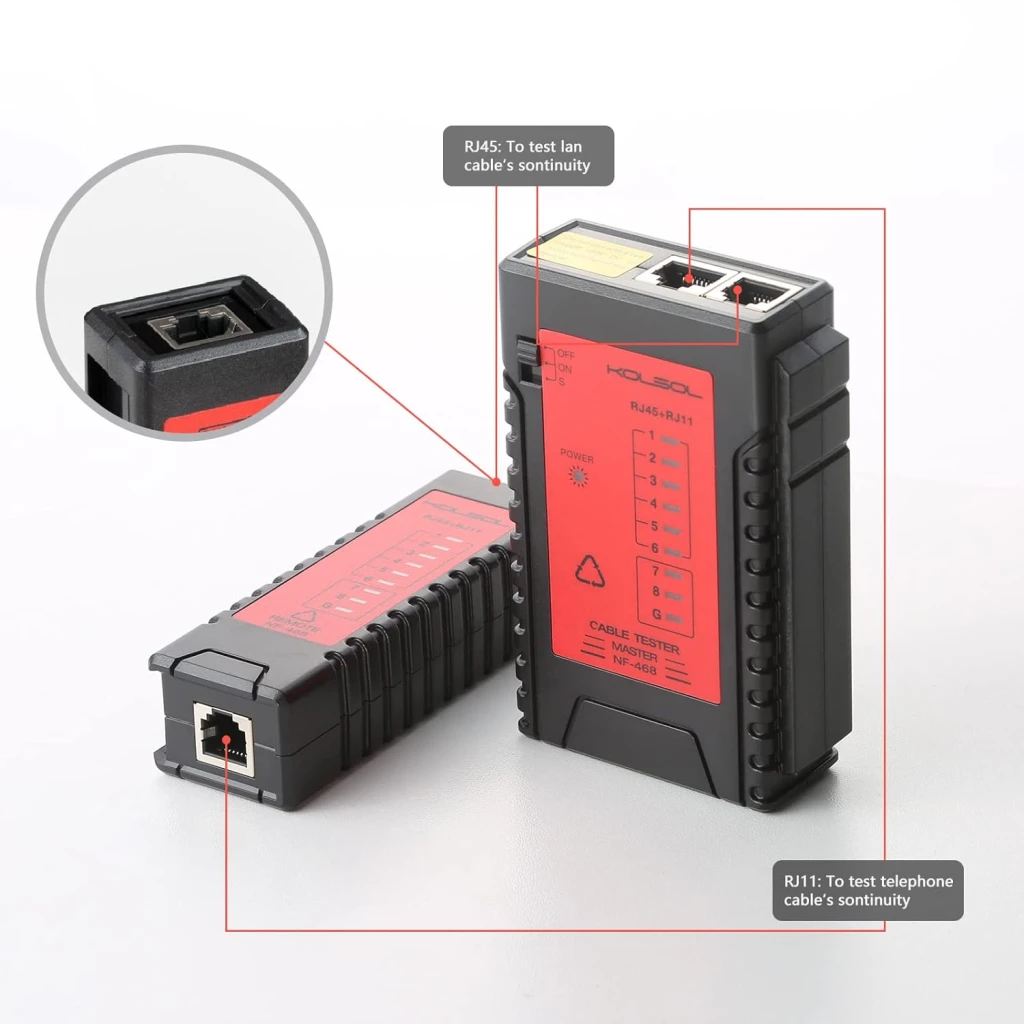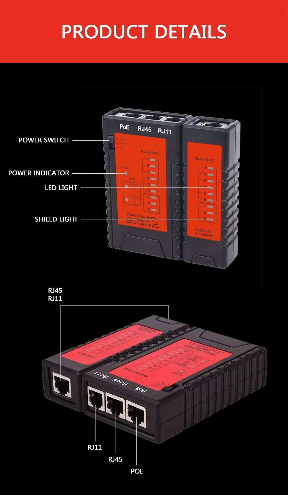 - Prueba de cables : Transmisor y receptor separables para probar respectivamente los cables de doble torsión 1, 2, 3, 4, 5, 6, 7, 8 y tierra.