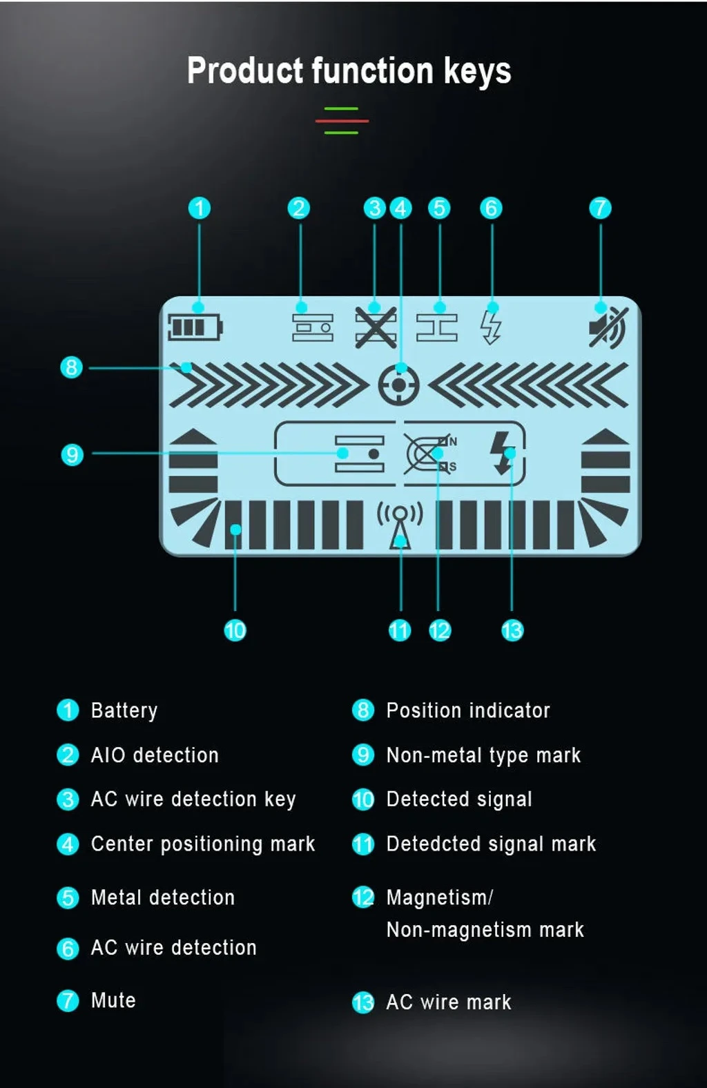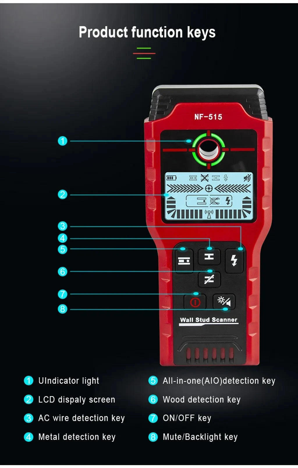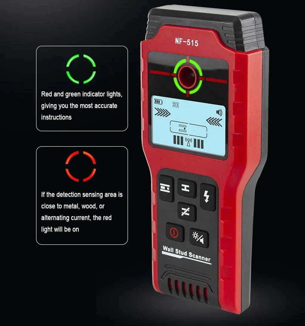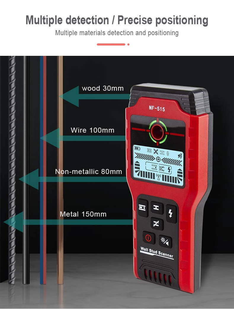 Presentamos el detector de pared avanzado, su rastreador confiable para madera, montantes metálicos, vigas, vigas, tuberías metálicas, varillas de refuerzo y, fundamentalmente, cables de CA con corriente ocultos tras paredes, pisos y techos. Con cuatro modos de funcionamiento intuitivos (sin metal, metal, cable de CA y escaneo integrado), el detector de pared le prepara para cualquier situación.