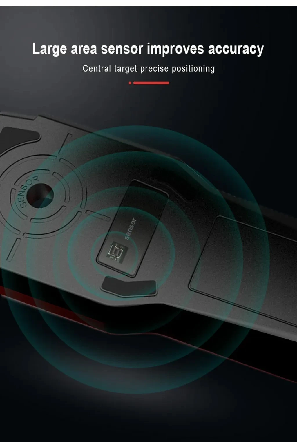 El detector de pared, que ofrece la máxima usabilidad, cuenta con una gran pantalla LCD con sonido potente para garantizar la ubicación precisa de vigas, metal y cables de CA. Su funcionamiento se indica mediante tres colores: el verde indica que se ha calibrado automáticamente y está listo; el amarillo indica que se está acercando al objetivo; y el rojo revela que ha encontrado el centro exacto del sensor.