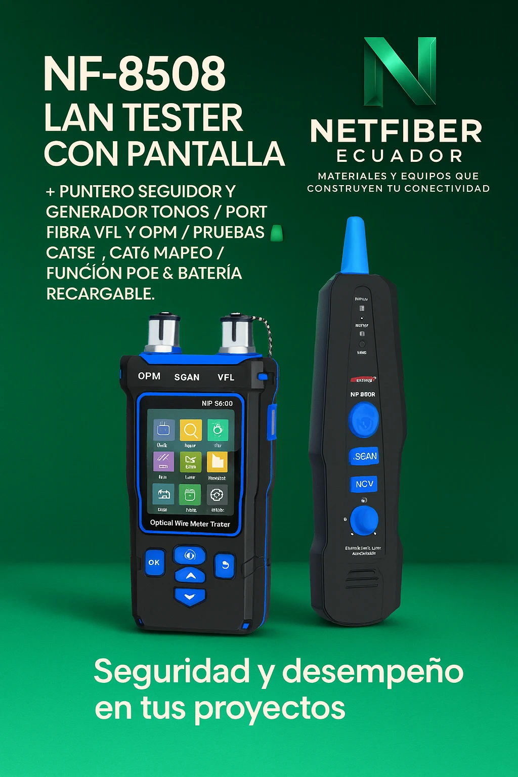 - Multifuncionalidad de prueba de cables 9 en 1: Combina 9 funciones clave que incluyen mapeo de cables, trazado digital de cables, parpadeo de puertos, medición de longitud de cables, comprobación de PoE, prueba de crimpado, OPM (medidor de potencia óptica), VFL (localización visual de fallos) y prueba NCV (tensión sin contacto), agilizando el diagnóstico de redes en un solo dispositivo.